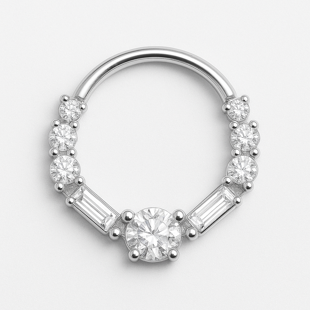 Zamansız bir ihtişamla tasarlanan Elara, merkezdeki iri taşın çevresini saran farklı kesim taşlarıyla klasik zarafeti modern bir yorumla buluşturur. Yuvarlak ve baget taşların dengeli yerleşimi, modele hem görsel zenginlik hem de simetrik bir incelik kazandırır.