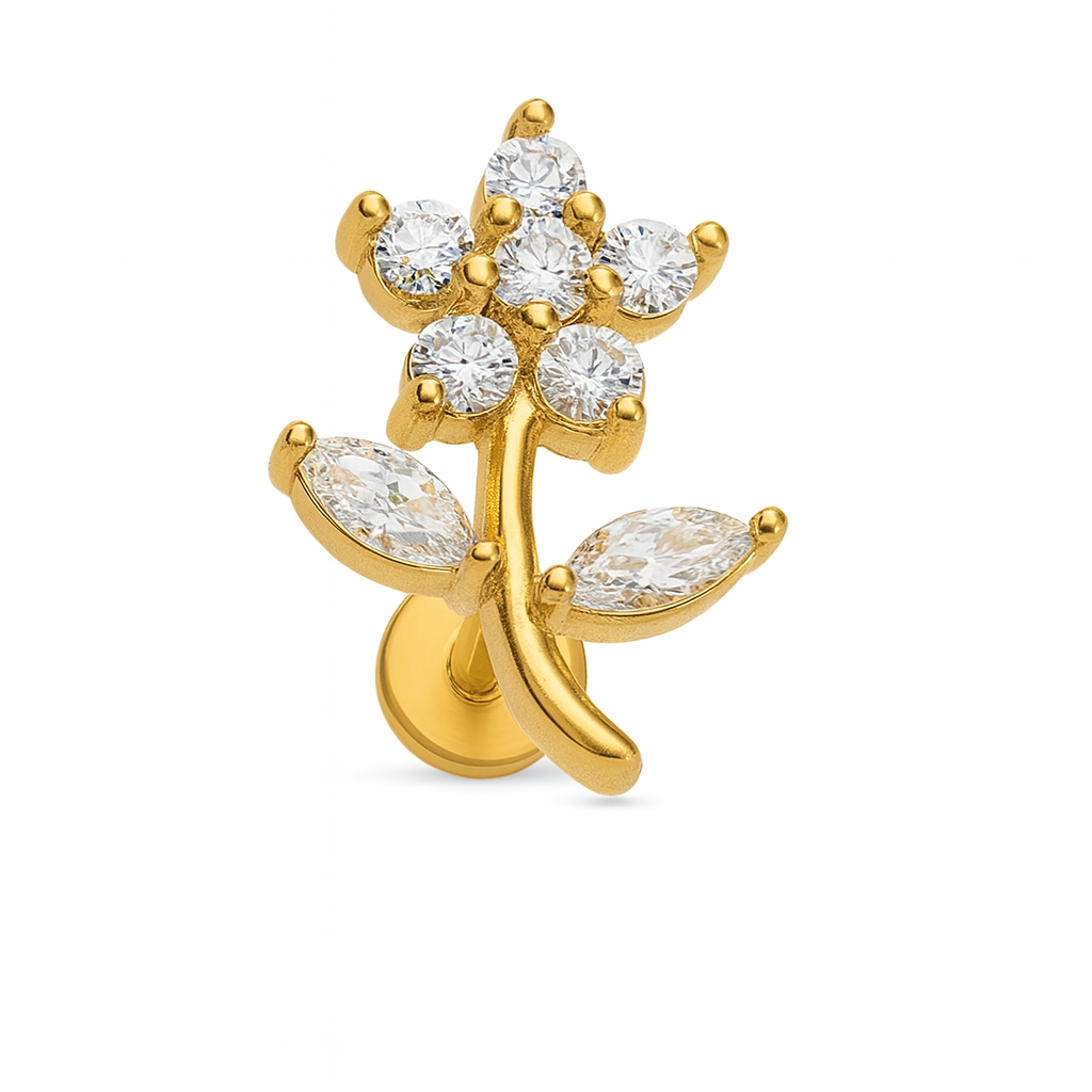 Beş taşlı çiçek formu ve yaprak detayları, kulağınızda zarif bir ışıltı yaratır